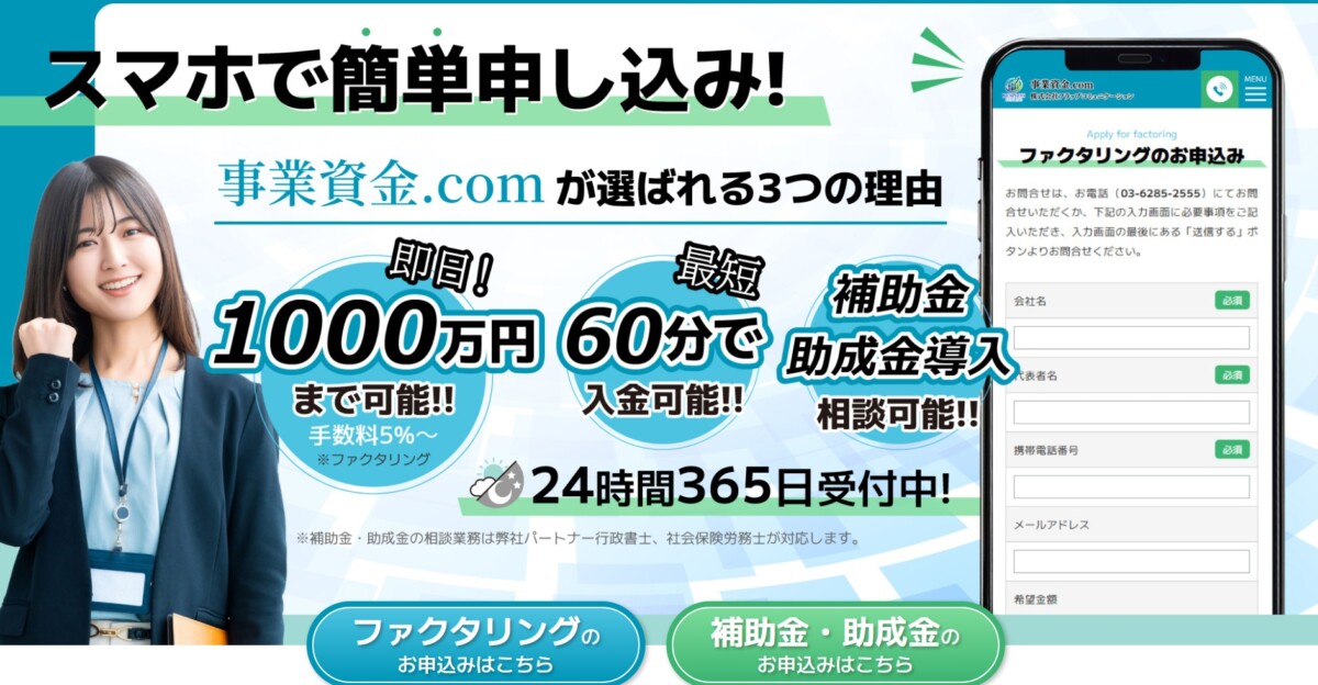 このたび、ファクタリングや補助金・助成金の相談ができる事業者向け資金調達支援サイト「事業資金.com」を開設いたしました。オンライン対応・来店不要で、資金繰りに関するさまざまなお悩みに幅広く対応しています。
